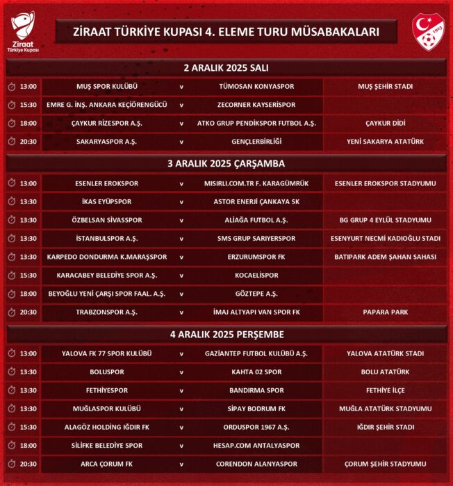 Ziraat Türkiye Kupası 4. Eleme Turu müsabaka programı Türkiye Futbol Federasyonu tarafından açıklandı. TFF, saha bilgisi henüz netleşmeyen karşılaşmaların oynanacağı statların daha sonra duyurulacağını belirtti.
